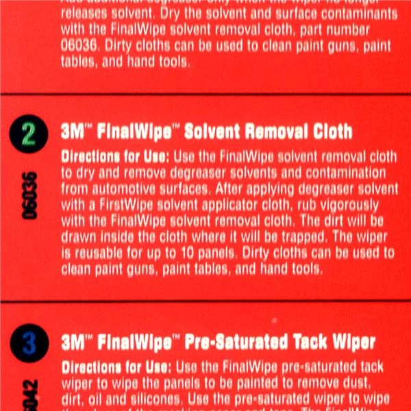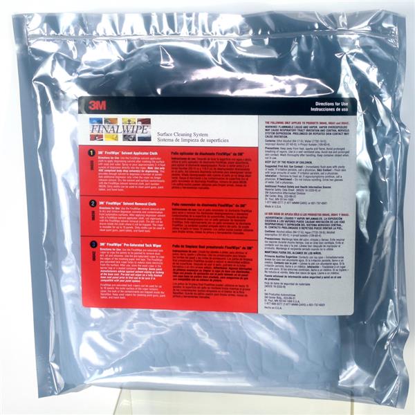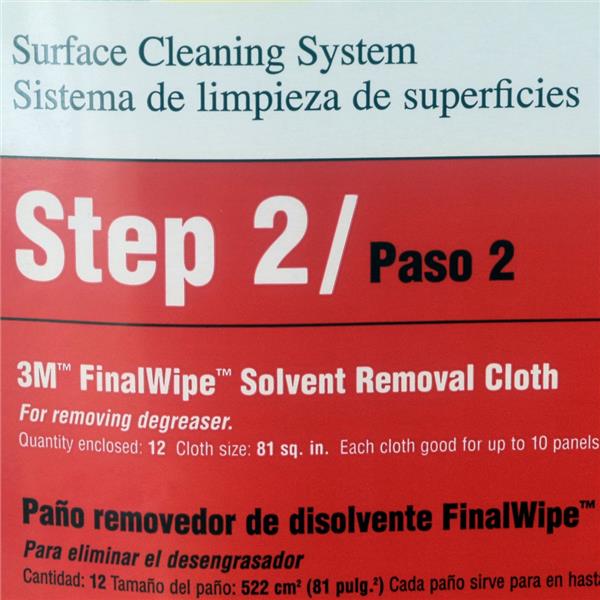 One sealed package of 12, 3M FinalWipe Solvent Removal Cloth. This is step 2 (Remove) of their 3 step time-saving, cost-effective paint prep system. Each super absorbent, lint free cloth is designed to dry and remove degreaser solvents and contamination from automotive surfaces. After applying degreaser solvent with a FirstWipe solvent applicator cloth, rub vigorously with the FinalWipe solvent removal cloth. The dirt will be drawn inside the cloth where it will be trapped. The wiper is reusable for up to 10 panels. Dirty cloths can be used to clean paint guns, paint tables, and hand tools. Each cloth is 81 sq inches and is good for up to 10 panels. Retail was between $25-28 per package.