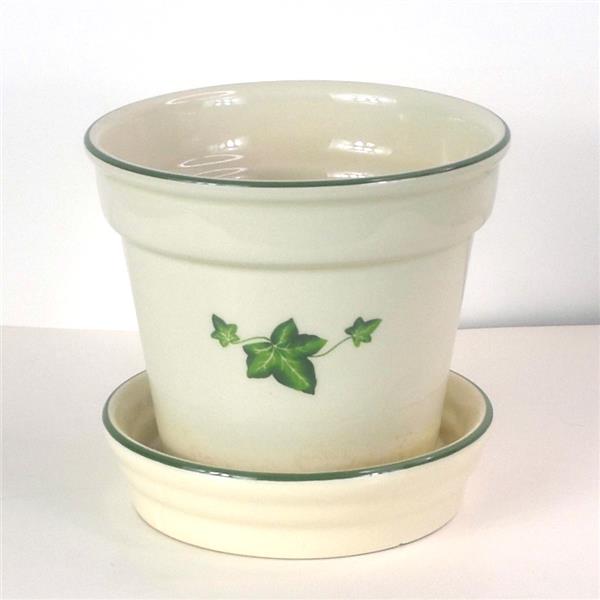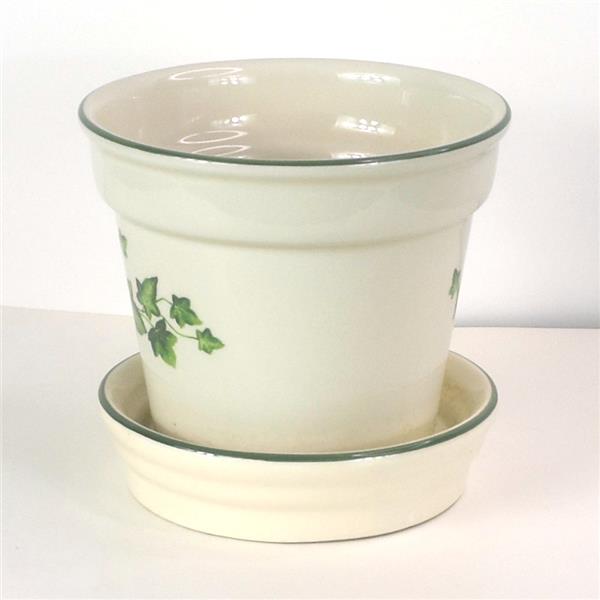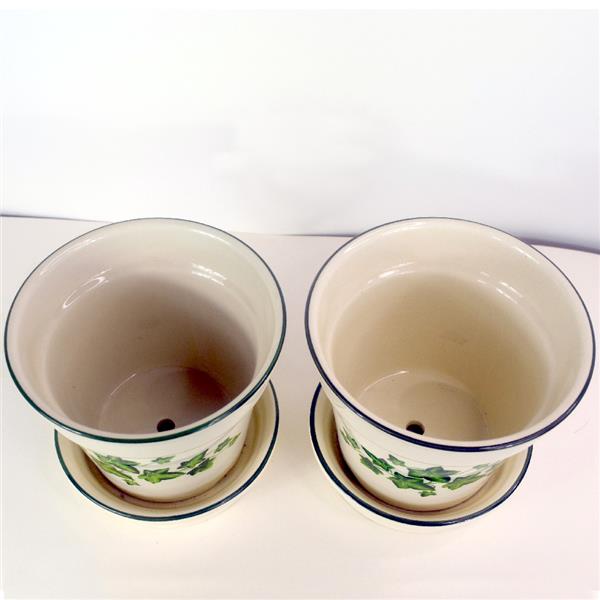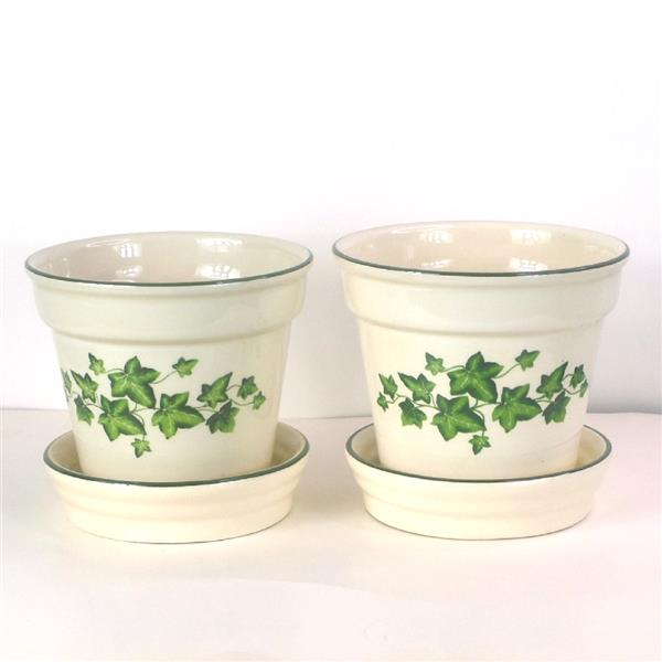 Two (2) 5" Indoor Ceramic Flower Pots with ivy leaf accent, preowned.