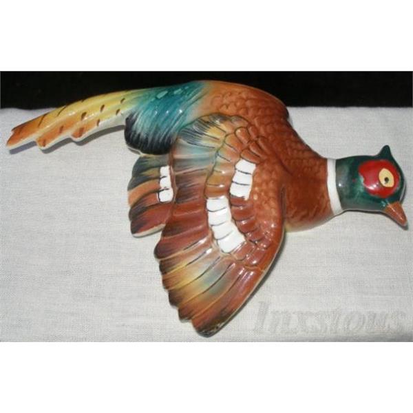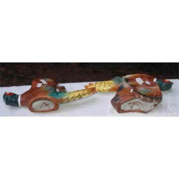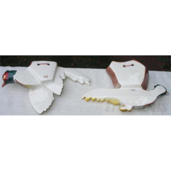 One pair of Pheasant Wall Pockets. This nice set of wall pockets are made in Japan. Each is approximately 7-3/4" l x 5" high. All decoration is underglaze except the eyes which are hand painted. The pieces are marked on the back.