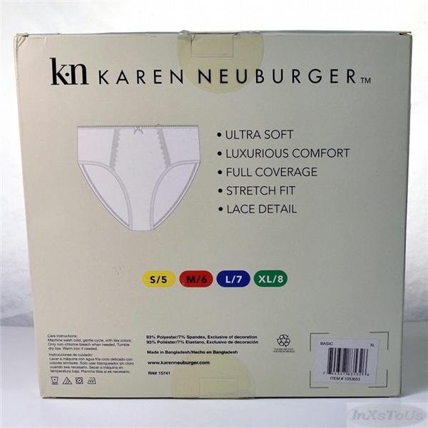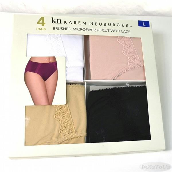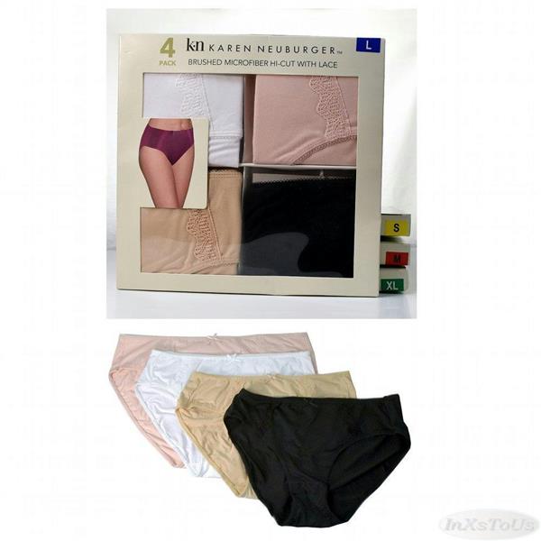 4 pack of Karen Neuburger Brushed Microfiber hi-cut with lace in Basics, Size Small. This is a soft to the touch full coverage, hi-cut pantie with beautiful lace accents and bow at the waist. It lays smooth, stretches to fit for no tug comfort.