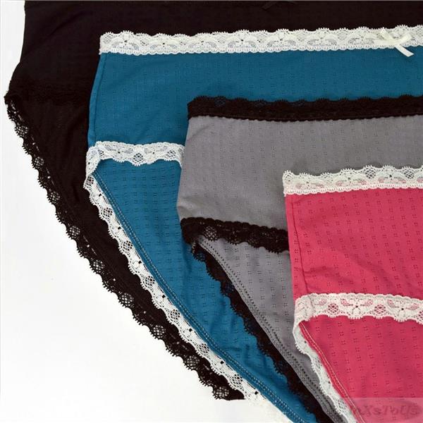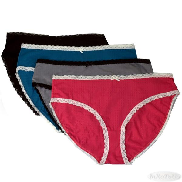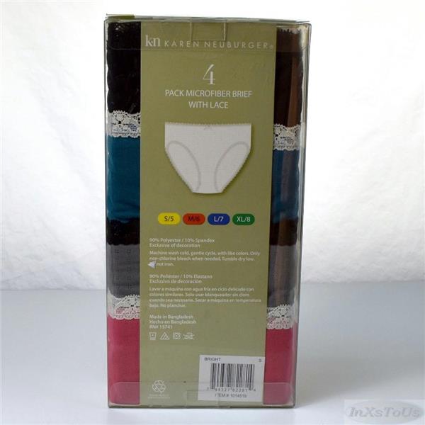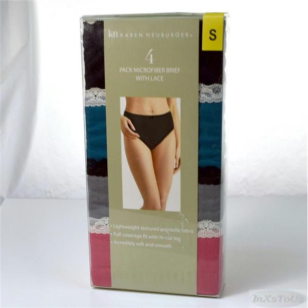 4 pack of Karen Neuburger Brushed Microfiber Pointelle hi-cut with lace in Bright. Choose your size from the drop down box above. This is a soft and smooth full coverage, hi-cut pantie with beautiful lace at the waist and lightweight textured pointelle fabric. It lays smooth, stretches to fit for no tug comfort.
