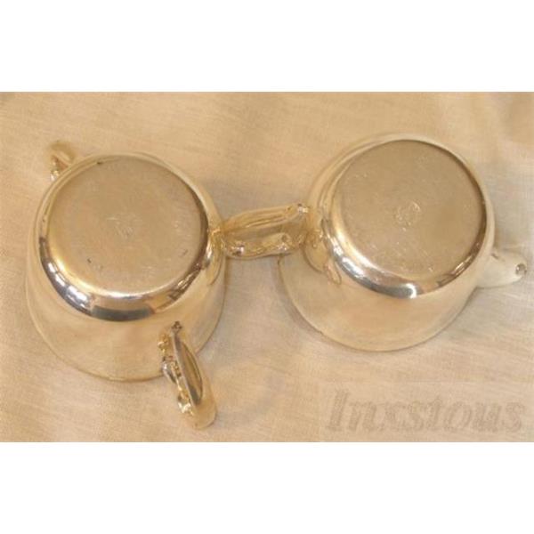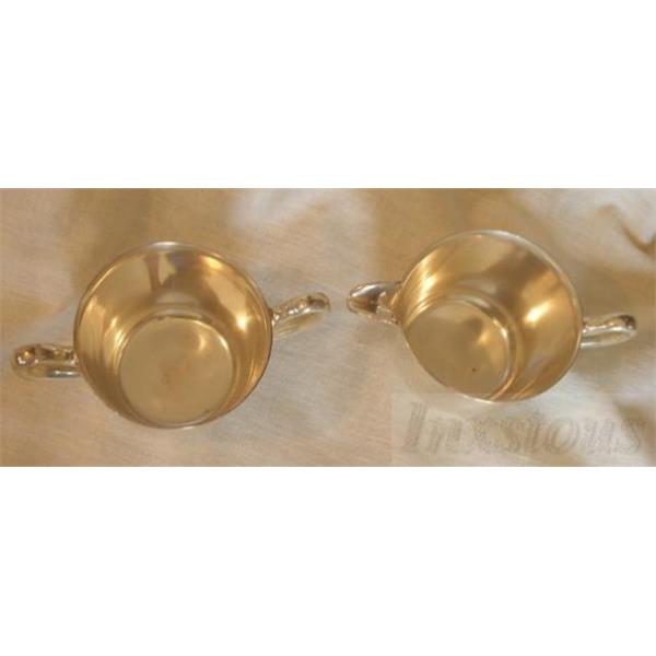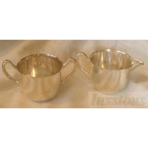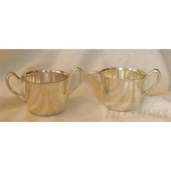 Vintage set of Academy Silver on Copper Sugar and Creamer set. This nice set is in good condition with a couple of marks and some wear. Each piece is just under 2 1/2" tall and 3" in diameter. Both pieces are marked Academy silver on copper on the bottom.
