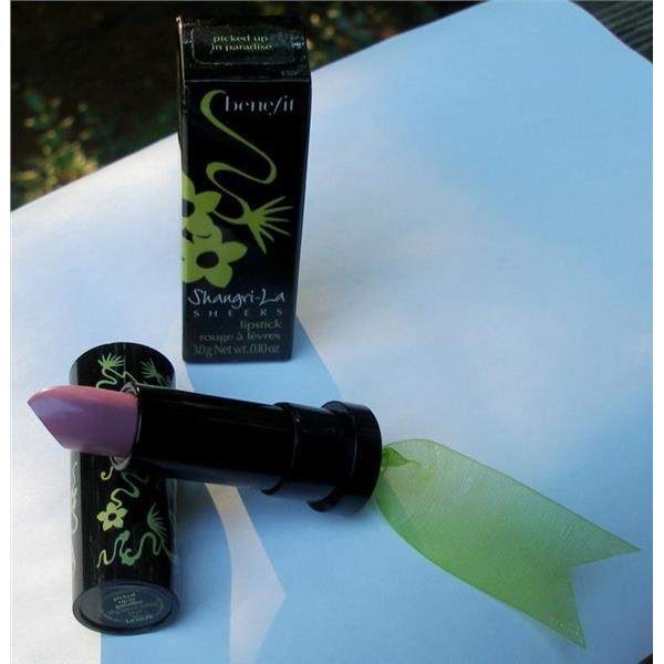 Benefit Shangri-La Sheers Lipstick in the shade Picked Up in Paradise. Benefit's Shangri-La shades are paradise island inspired. The lipstick shades are bold yet sheer with fairly decent staying power. The packaging is absolutely gorgeous. Your lipstick comes in a beautiful black lacquered container adorned with silkscreen flowers and a hand tied silky green ribbon on the end. Picked up in Paradise is a sheer yet bold beautiful violet/lavender shade. Boxed.