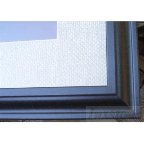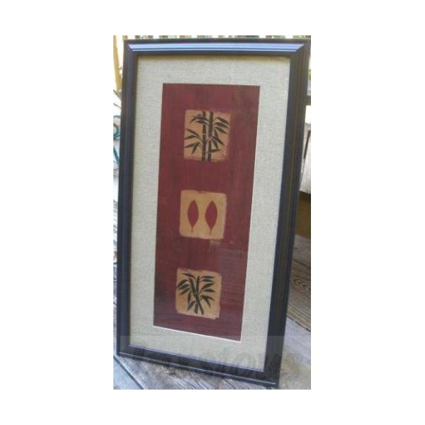 There are 3 pictures the 2 outers are a silhouette of sugar cane branches and the middle picture is of 2 leaves. It is framed by a deep red followed by wheat colored textured material. The frame is wood with a black finish and, of course glass. It measures 14"w x 26-1/4"h.