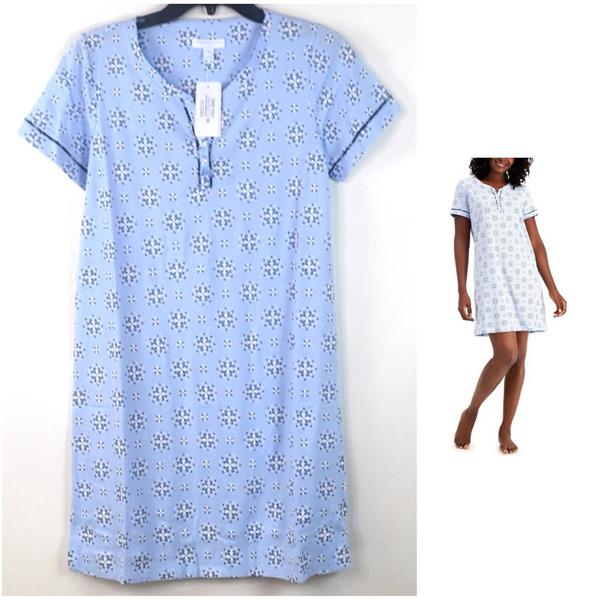 Charter Club Women's Printed Cotton Sleepshirt Nightgown in Medallion, new with tags, no retail packaging. Choose size from the drop down box above. Soft, comfortable and great for lounging and sleep. This lightweight pull-on style all cotton nightgown has a notched v-neckline with 3 button placket and short sleeves in blue with an allover medallion pattern. Retail $29.99