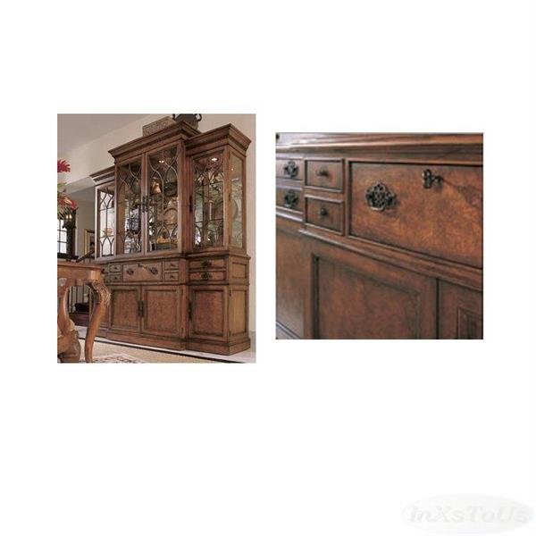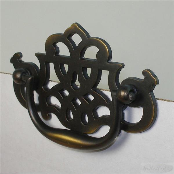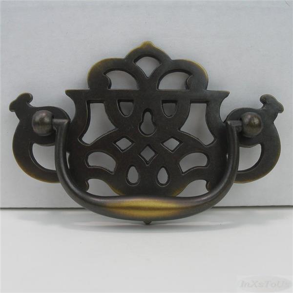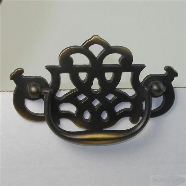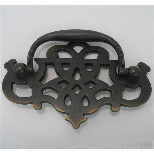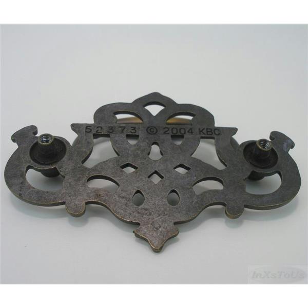Chippendale Style Cabinet Drawer Backplate and Handle in Antiqued Dark to copper finish. This ornate handle has an elegant pierced design and copper edging and accents. These Drawer Handles were used for the Thomasville Ernest Hemingway Savoy China Cabinet. Maker KBC, backplate part number 52373, handle 20087.