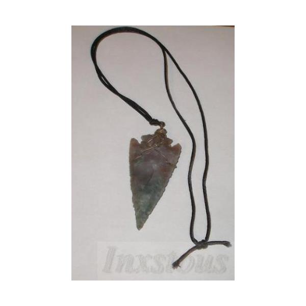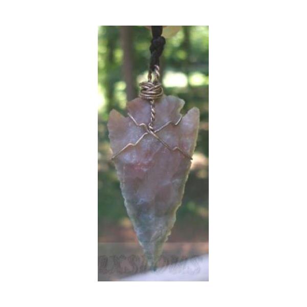 Agate Arrowhead Pendant. This stone is hand knapped and wrapped with copper wire. It is approximately 2-1/2"h x 1-1/2"w (at widest point) x 5/16"d on a 26" black silk string.