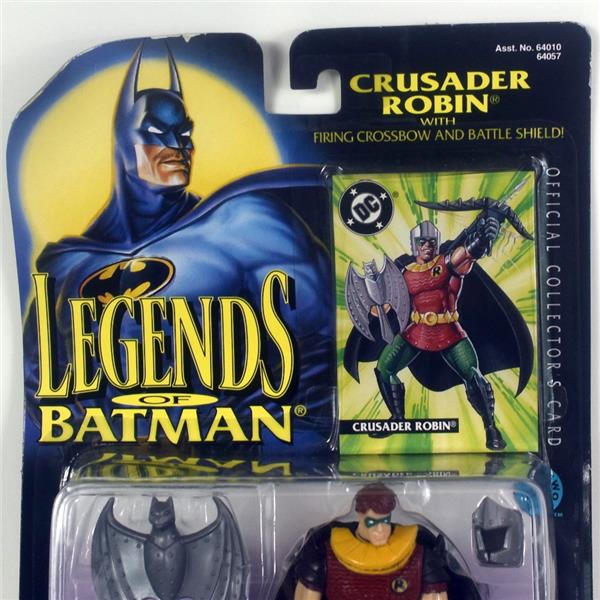 Crusader Robin Crossbow & Shield Set from Legends of Batman Series on Card. This 1995 action figure features Robin from the legendary DC Universe. The figure comes with helmet, firing crossbow with arrows, and battle shield made of durable plastic. Also included is an official collector's card. Fans of the vintage 90s era will appreciate this original Kenner release from the Legends of Batman Series. The set is suitable for children ages 4+. The figure is based on the classic TV show Batman and Robin.