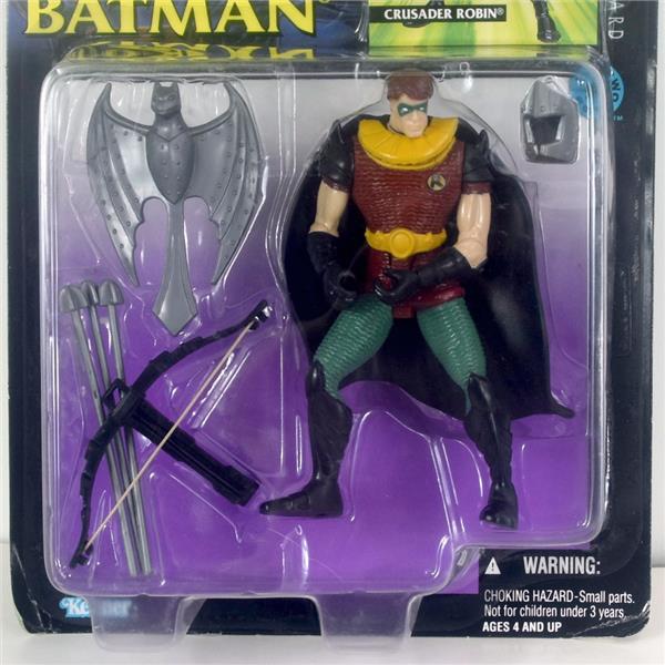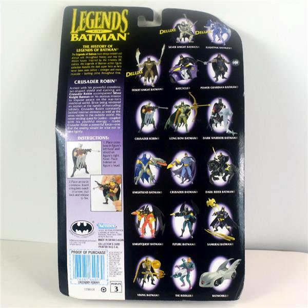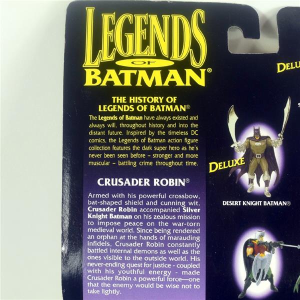 From the back of the card: "Armed with his powerful crossbow, bat-shaped shield and cunning wit, Crusader Robin accompanied Silver Knight Batman on his zealous mission to impose peace on the war-torn medieval world. Since being rendered an orphan at the hands of marauding infidels, Crusader Robin constantly battled internal demons as well as the ones visible to the outside world. His never-ending quest for justice - coupled with his youthful energy - made Crusader Robin a powerful force - one that the enemy would be wise not to take lightly."