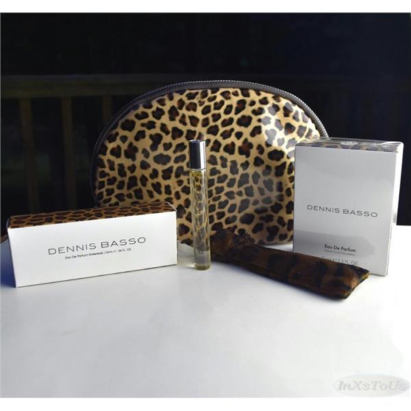 This gift set includes two Dennis Basso parfumes: a 2.5 oz eau de parfum, a 0.34 oz Eau De Parfum Rollerball , and a zip close 9" x 6-1/4"w x 2-1/4"d wipe clean animal print cosmetic bag. Dennis Basso Eau De Parfum is in a clear bottle with faux-fur accents on the side and lovely rectangular side cut top. The rollerball is the same fragrance with a faux fur drawstring close cloth case making this purse and travel friendly.