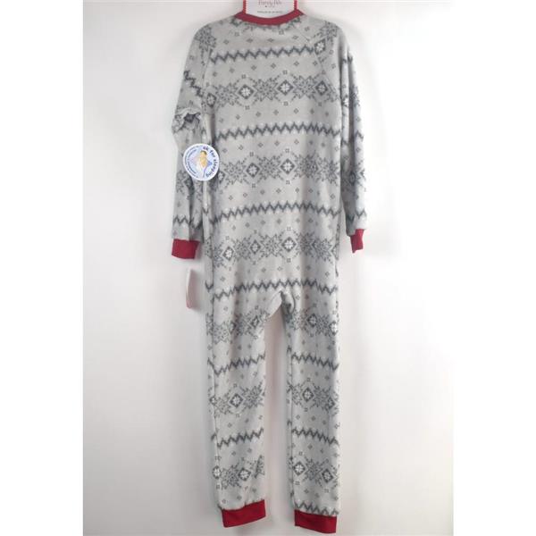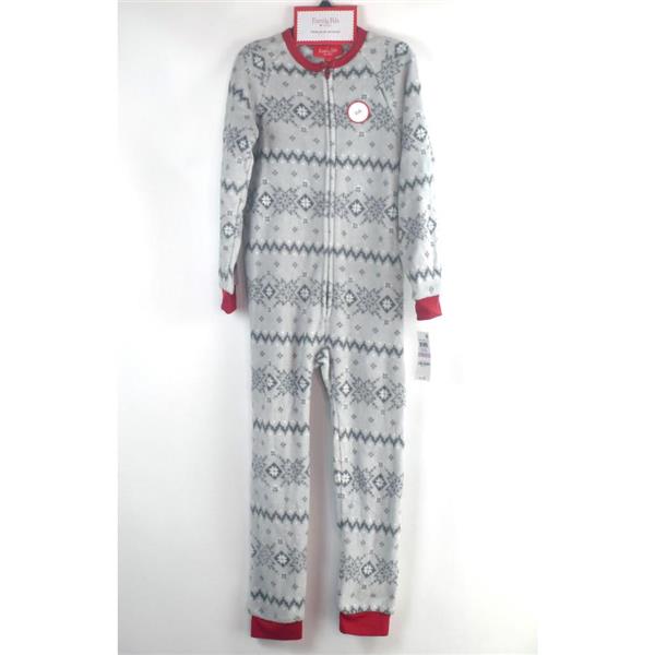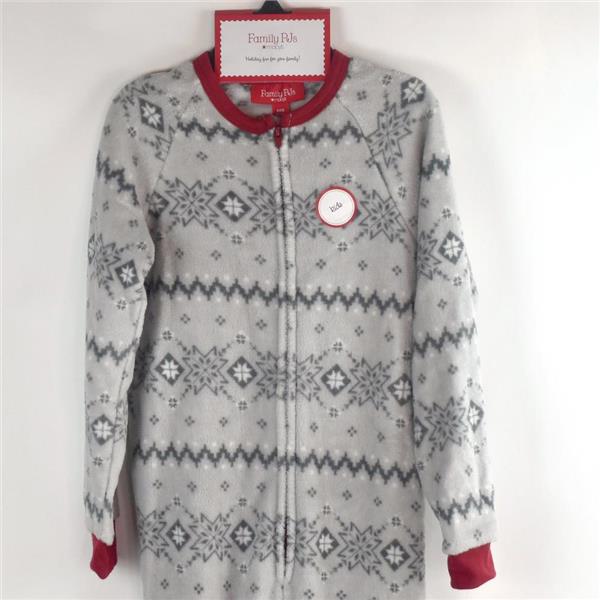 Family PJs Kids One-Piece Pajama in Winter Fairisle, New with tags, no retail packaging. Soft, fleece, comfortable and safe to sleep in. This cute footless one-piece pajama is Gray with a festive Fairisle print, front zip and red banding on the legs, arms, and neckline.