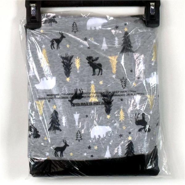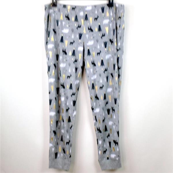 - Jogger style pajama pants: Gray with allover black and gold trees, white polar bears, deer and moose print