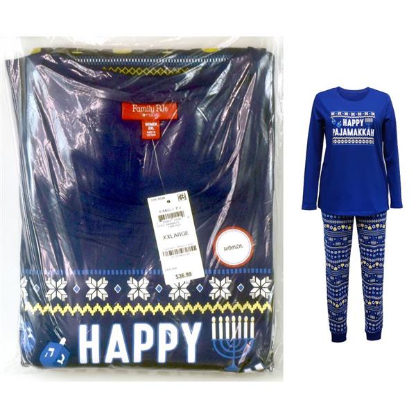 Family PJs Womens 2-pc Pajama Top and Pants set in Happy Pajamakkah, New with tags, no retail packaging. Choose size from the drop down box above. This set has a long sleeve cotton blend top with graphic and all cotton blue print jogger style pants with allover print. Retail $37