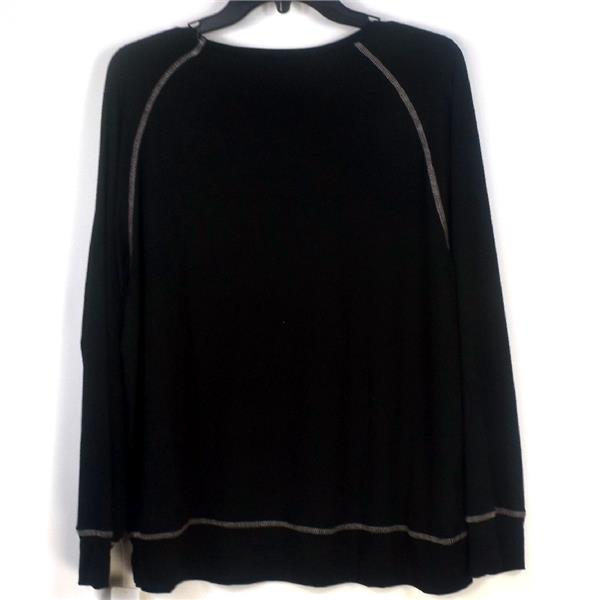 - Solid Black Pull-on top, round neckline, long sleeves with cuffs, banded hem, and stitch accents