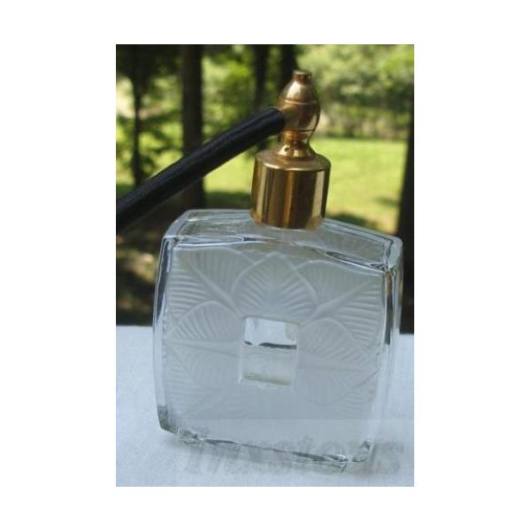 Perfume Bottle with Leaf Design and atomizer. It is approximately 4-1/4"h x 2-1/2"l x 1"d. It is clear glass with frosted textured leaf design and gold top. The atomizer is approximately 11"long (includes tassle), is connected with gold and has black tassle at the end.