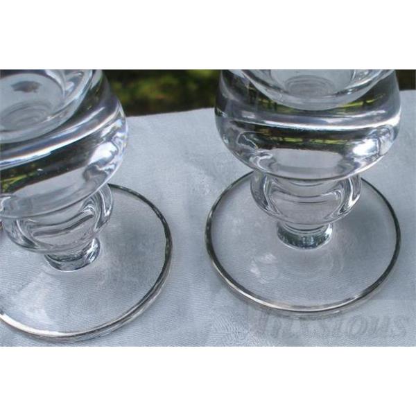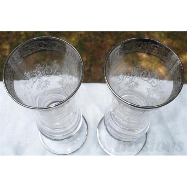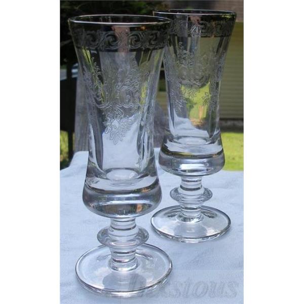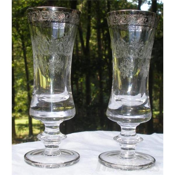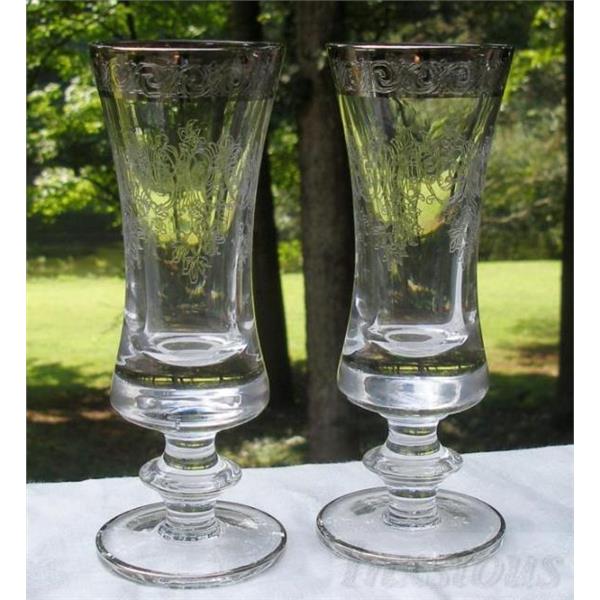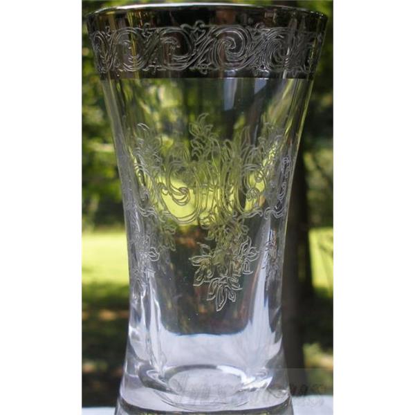 This pair of glasses exudes sophistication with their hourglass shape, flared rim with thick base on a round shaped stem with platinum border. The glass is 6-5/8"tall and 2-3/8"w at top with a 2-1/2" round base. It has a gorgeous lace style etched design and wide 5/8" etched platinum band. These lovely glasses are just asking to be held. We were unable to find the maker of this glass.