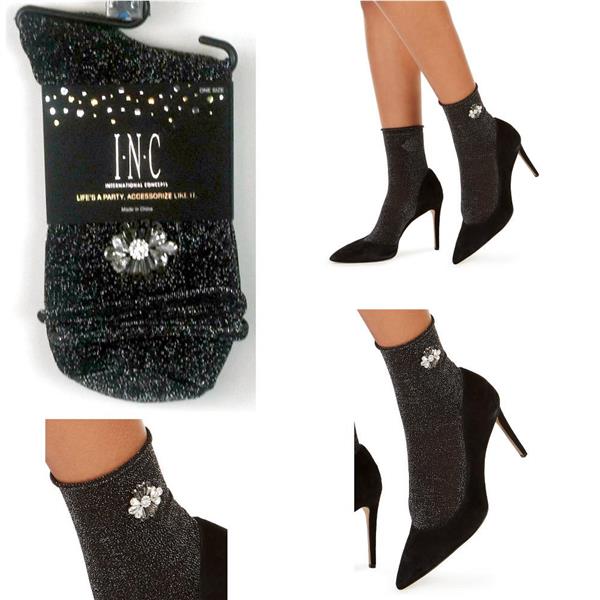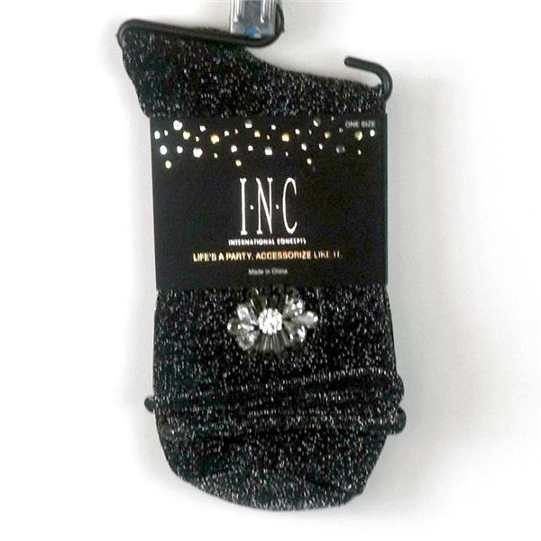 One (1) pair INC International Concepts Life's a Party Embellished Anklet Fashion Socks, One Size, New with tags, no retail packaging. When you decide your socks deserve an accessory and you want to make a statement, turn to the INC Embellished Ankle Socks. These are black with metallic silver thread for a sparkly look, have a roll top hem, and the outer sides have a center floral embellishment in light reflecting clear and smokey "gems". Retail $15