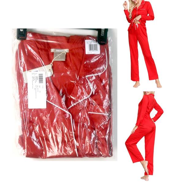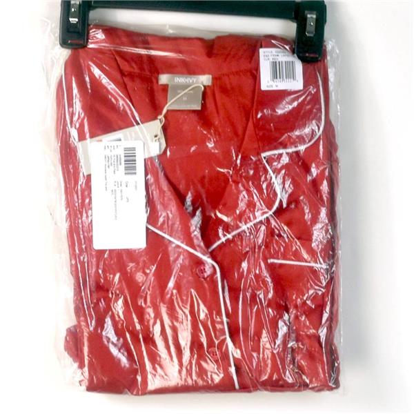 INK+IVY Women's 2 piece Pajama Notch Collar Top & Pants Set in Red, Size Medium, New with tags, No retail packaging. Sleep comfortably in this soft satin 2 piece pajama set. This set features a Notch collar button-front top with a trimmed chest pocket and pull-on pants with drawstring waistband. Retail $64.
