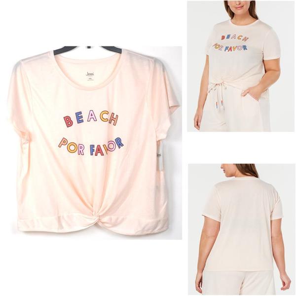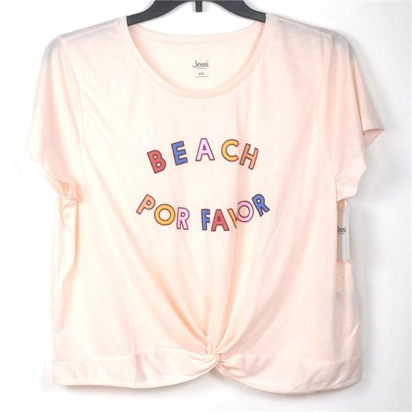 Jenni Women's Short Sleeve Soft Twist-Front Graphic Pajama Top in Beach Por Favor, New, No retail packaging. Choose size from the drop down box above. Sleep comfortably in this soft pajama top. It features short sleeves, a rounded neckline, twist-front accent and colorful graphic "Beach Por Favor".
