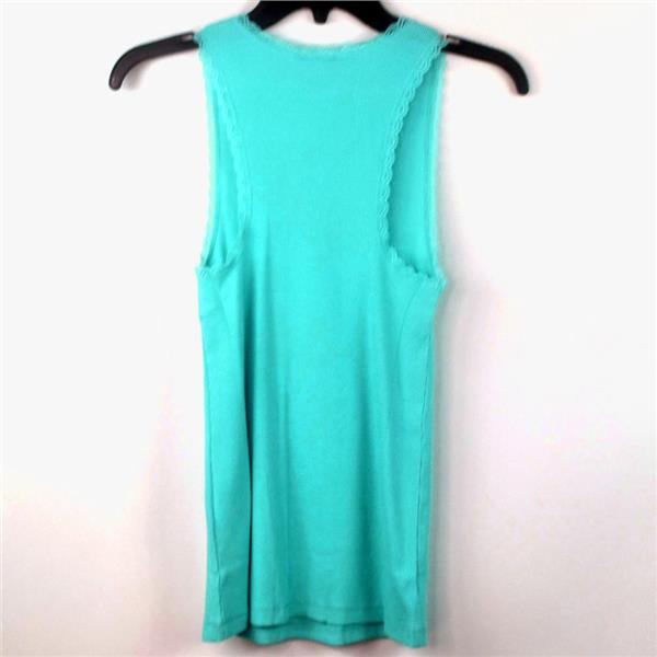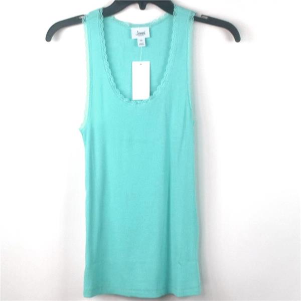 Jenni by Jennifer Moore Lace Trim Ribbed Pajama Tank Top in Tropical Tide, Size XS, New with tags, no retail packaging. Lounge in comfort with this ribbed pajama top. This pull on top is a cotton with a bit of stretch knit mini-ribbed fabric with a Lace Trim scoop neckline.