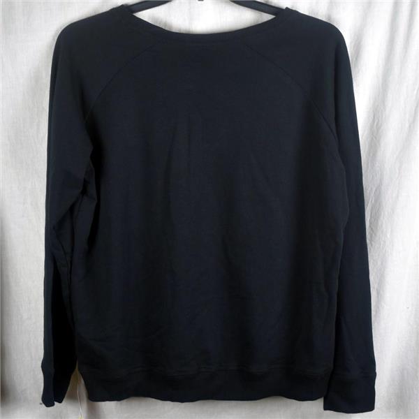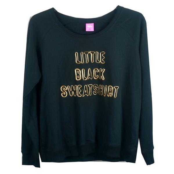 Jenni by Jennifer Moore Graphic Pajama Top in Little Black Sweatshirt. Choose size from the drop down box above. Lounge in comfort with this adorable pajama top. This pull on sweatshirt style top has a soft fleece inside, ribbed neckline and cuff with stitched gold lettering "Little Black Sweatshirt".