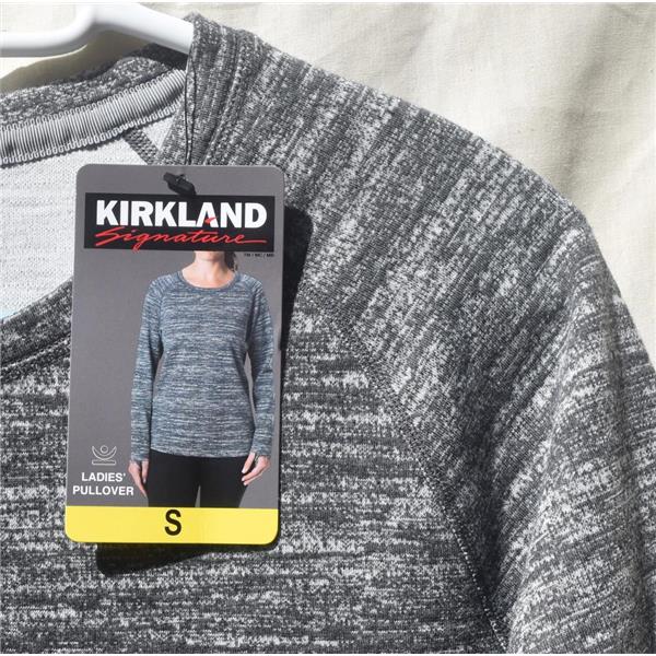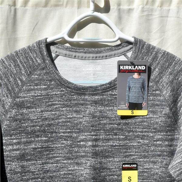 Kirkland Signature Women's Active Pullover Size Small in Dark Gray heather, new with tags. Step into comfort with this soft pullover. It has a crew neck, long sleeves, Thumbholes, lightly curved hem, and asymmetrical accents on the back.
