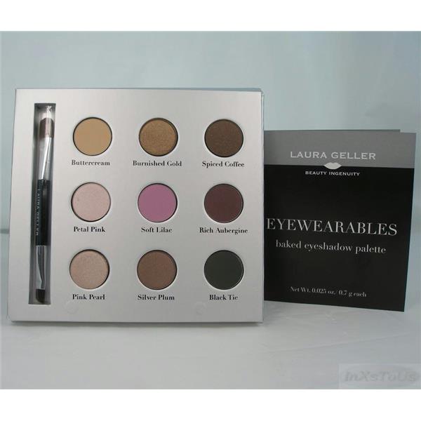 Laura Geller Eyewearables Baked eyeshadow palette, Discontinued, New. This is a flip open palette with 9 baked eye shadows, a mirror on lid, and a dual ended applicator. Mix and match the pigment rich, water resistant light to dark shades to create the look that is right for you. Includes a "to use" pamphlet