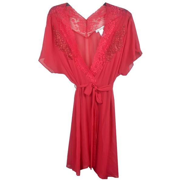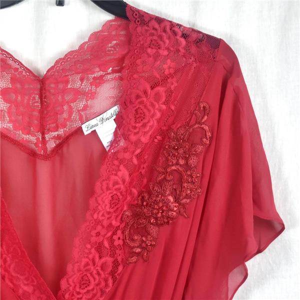 Linea Donatella Juliet Lace-Trimmed Chiffon Wrap Robe Only in Crimson Red Size S/M , New with tags, no retail packaging. Create a feminine nighttime look with this wrap robe. This soft to the touch robe has a wide lace trim border to the waist, attached belt, bead embellished lace accents with flowy hemline and sleeves.
