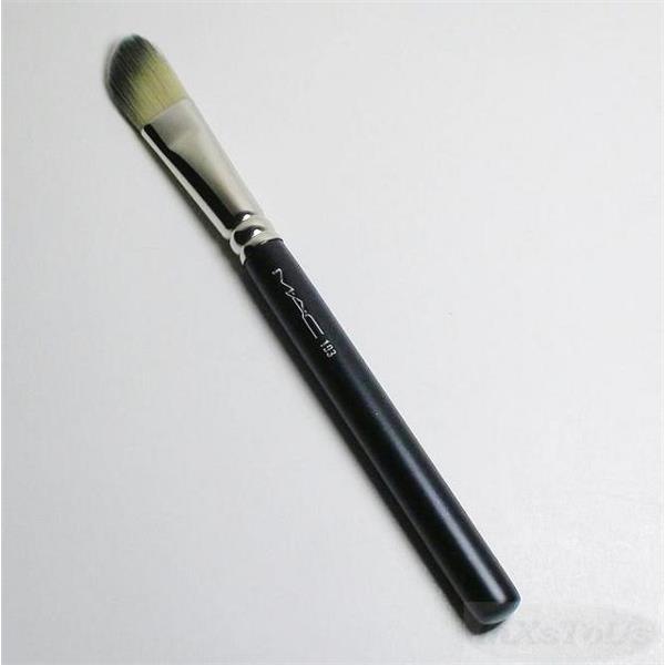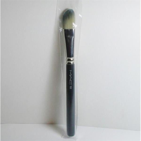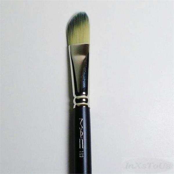 MAC Cosmetics 193 Angled Foundation Brush. The angled foundation brush helps you achieve a silky, flawless finish. Angled so you can apply easily to all areas of the face. Black wood handle and nickel-plated brass ferrule.