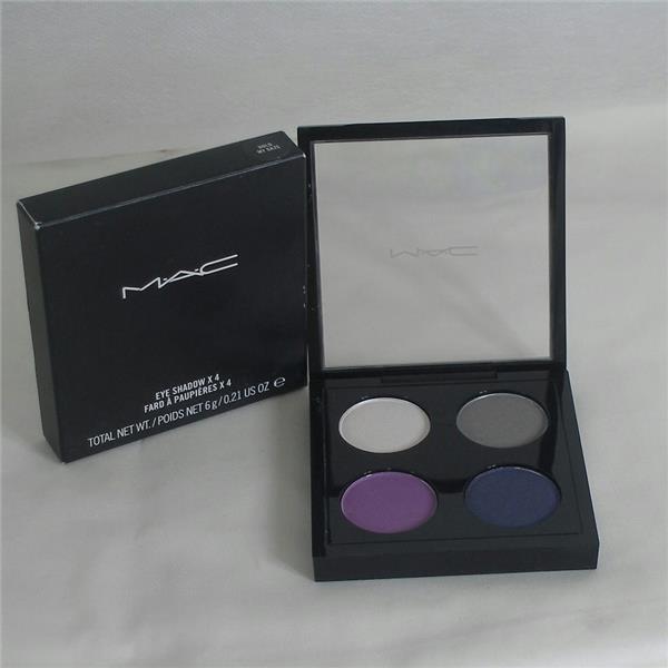 MAC Eye Shadow X 4 in Hold My Gaze. 4 complimentary shades and textures chosen by the experts at MAC in one compact. Each powder shadow is highly pigmented, applies smoothly, blends easily and is buildable. The shades: White Rabbit (Frost, soft white), Dame's Desire (Frost, mid-tone reddish purple), Deep Secret (Frost, deep indigo), and Hold My Gaze (Satin, mid-tone cool green grey). Housed in magnetic close, slim, black case with clear top for easy viewing.