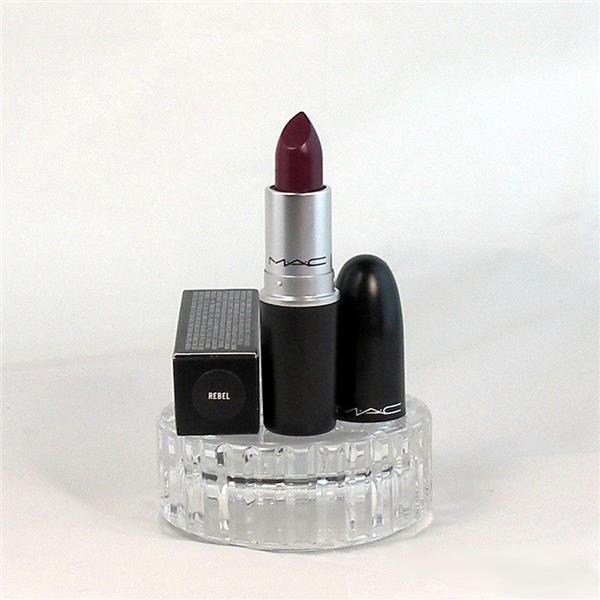MAC Satin Lipstick in the shade Rebel. Satin lipstick is a rich color lipstick with a semi-matte finish. Rebel is a mid-tone cream plum (Satin) Shade.