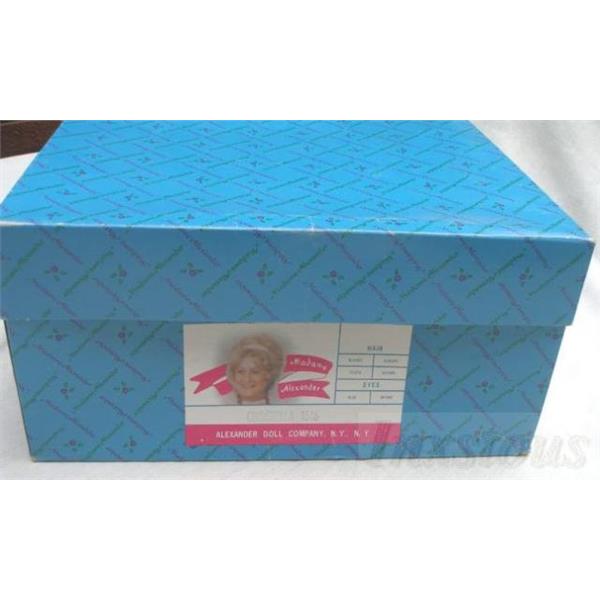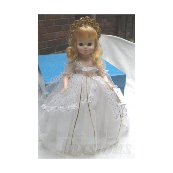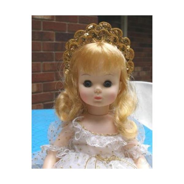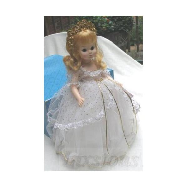 Size14"MaterialPlasticHairBlondeEyesBlue (they look clear or hazel to us)OutfitA gorgeous white gown sheer netting with gold trim, puff sleeves and gold cord sash. Underneath is a white silk slip with lace trim followed by a taffeta slip, and white pantaloons with lace trim. The stockings are sheer and the shoes are goldAccessoriesGold crownMarking on back of headAlexander and 1965