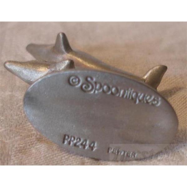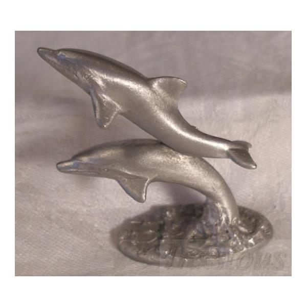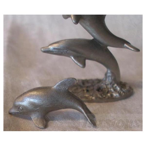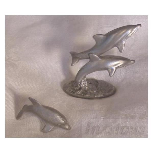 Spoontiques Pewter Dolphins #PP442 and P113. The first is two beautiful pewter dolphins with one swimming and one leaping are approximately 2" h x 1-6/8" w x 1/2" deep. The second is a single pewter dolphin 1-1/4"l x 1/2"h x 6/8"w.
