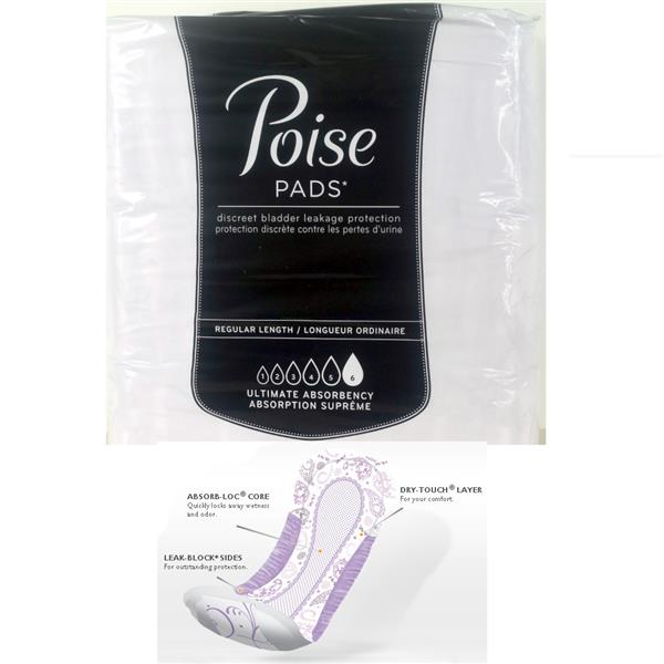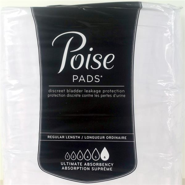 Poise Incontinence Pads for Women, 6 Drop, Ultimate Absorbency, Regular, 36Ct, Sealed package, NO Box. Poise incontinence pads for women are made for bladder leaks, unlike period pads, which are meant for menstrual needs. With up to 12 hours of protection, you can trust the original design of Poise Ultimate Absorbency, Regular Pads to handle unexpected gushes from bladder leakage. Poise incontinence pads offer the trusted 3-in-1 protection for dryness, comfort, and odor control. Prevent leaks and quickly lock away wetness with Leak-Block Sides and an Absorb-Loc Core. Poise Pads feel comfortable and stay 10x drier than leading period pads and can be used as a postpartum pad or maternity pad for women after birth who experience heavier bladder leakage. Poise pads absorb bladder leaks, lock away wetness, and neutralize odors, helping you feel clean and fresh throughout the day. Will ship in discreet packaging.