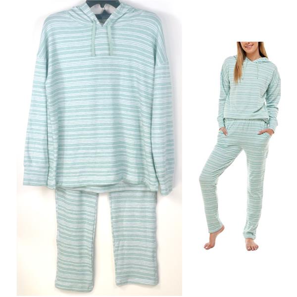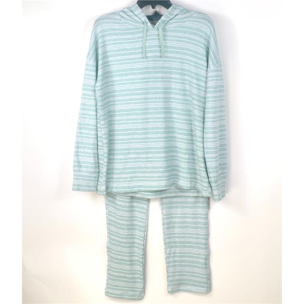 Roudelain Women's Butter Knit Hoodie Top & Pants Pajama Set in Green Stripe, new with tags, no retail packaging. Choose size from the drop down box above. With this ultra soft pajama set, there will be little time for counting sheep. It has a long sleeve top with attached hood and matching tapered pajama pants. Retail $58.