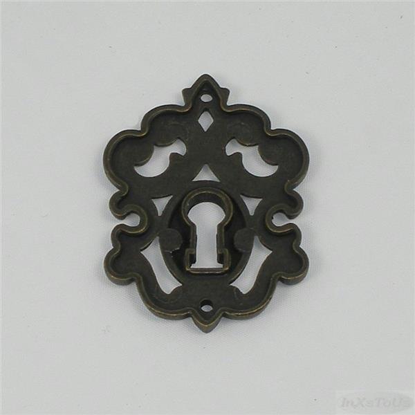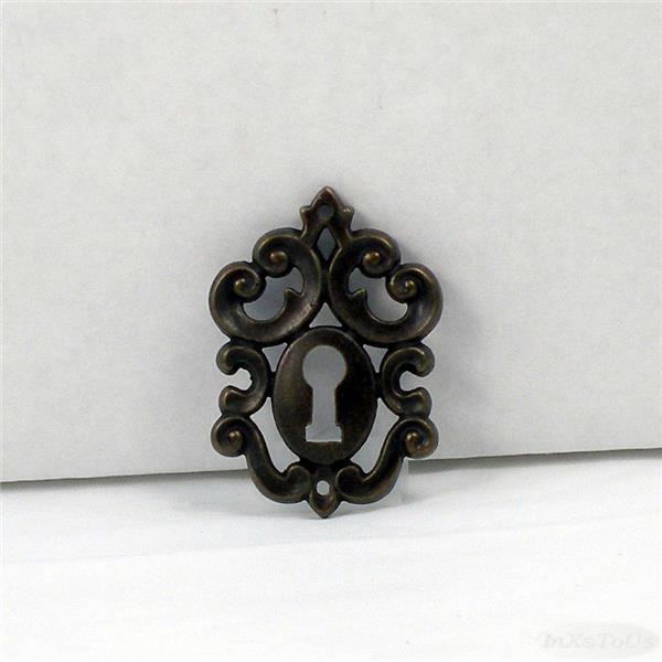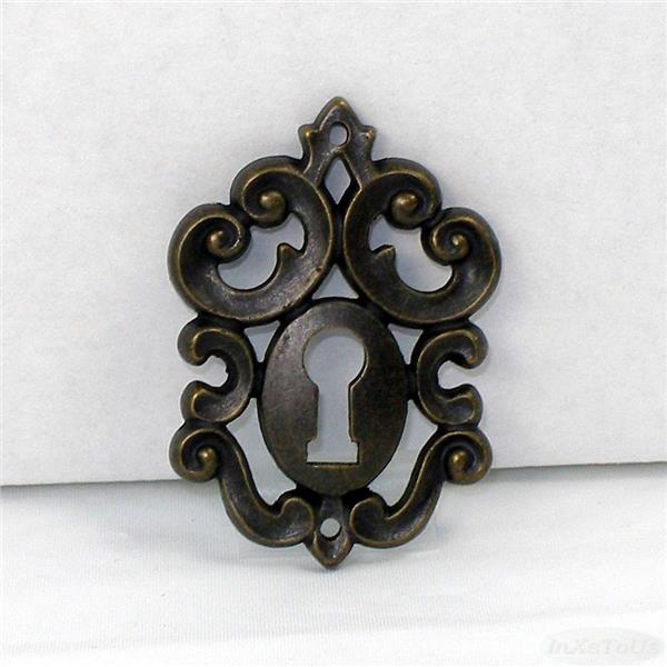 Decorative fancy scroll work Escutcheon Key Hole Cover with a deep bronze finish for Cabinet Furniture such as dressers, desks, chests, cabinets and more. Recapture the elegance of an earlier time with this with this keyhole cover bordered in fancy scroll work.