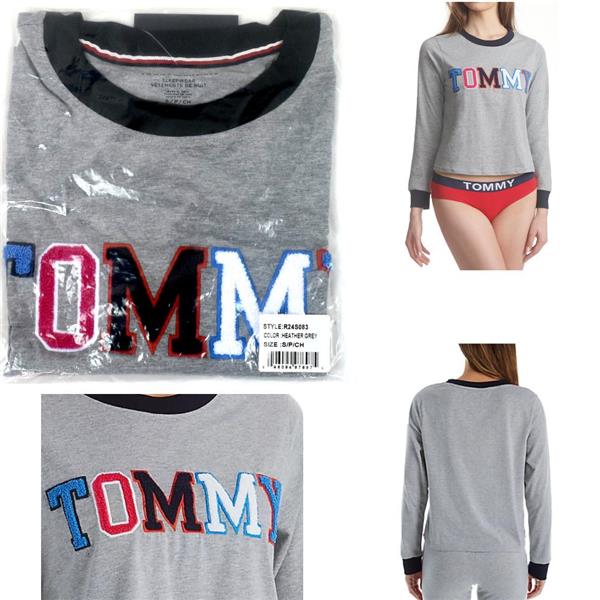 Tommy Hilfiger Women's Long Sleeve Pajama Top in Grey Heather, New with tags no retail packaging. Choose size from the drop down box above. This comfortable cotton blend varsity style pajama top has a contrast neckline and cuffs with a colorful raised "Tommy" front and center. Quality made and adorable. Retail $59.