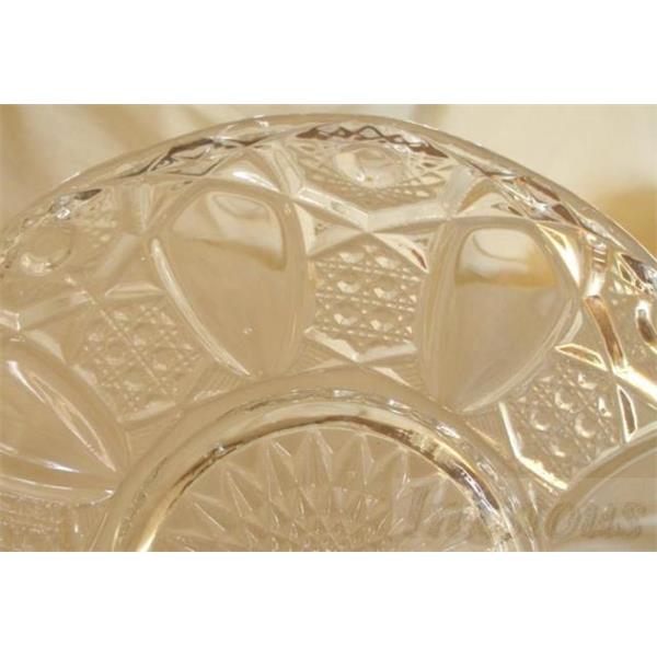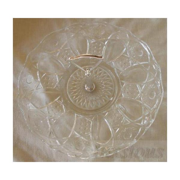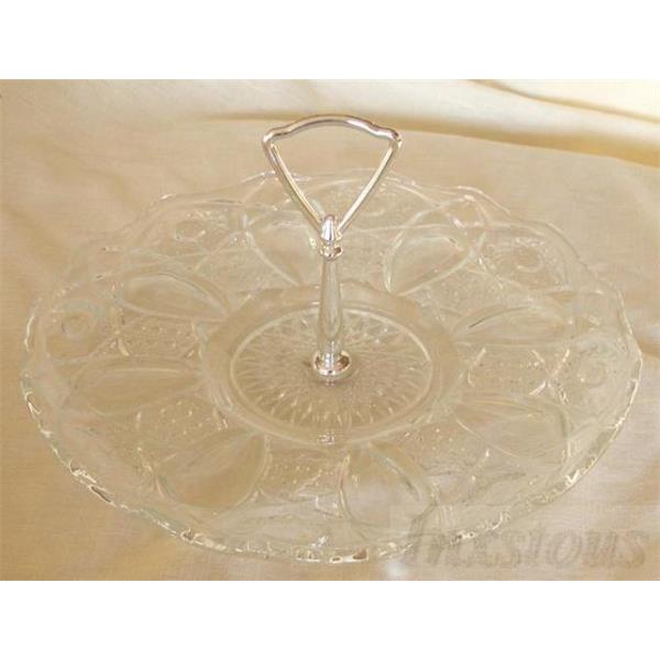 Glass 10" round Serving Dish with Silver Handle. This is clear glass, has a lightly curved border with alternating patterns that are textured underneath and a sunburst center design. The handle is silver, approximately 4"h with modified triangle shape handle. An elegant, welcome piece for your table.